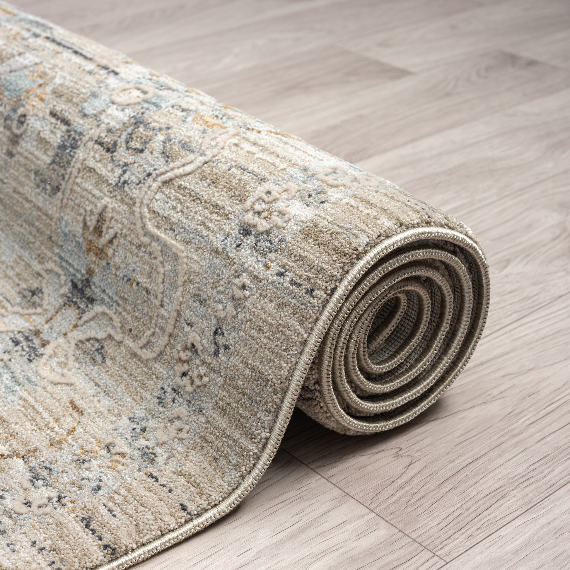 This exquisite rug is the perfect foundation for modern farmhouse ensembles that effortlessly anchors your look. It's made in Turkey and crafted from a blend of cross-woven pile using multi-textured polyester fibers, power-loomed into a soft cotton base, making it resistant to stains and spills. The Oriental-inspired pattern with scrolling botanical accents and a bordered motif give this piece a touch of traditional appeal, while the distressed design elevates the look with vintage charm. The muted, harmonious color palette used in these rugs make them blend into a variety of spaces. Plus, its low .25" pile height is easy to clean and works well in high-traffic rooms like the kitchen or bathroom floor space in your home and will complement almost all color schemes. This highly decorative collection also contains shed-resistant and anti-static properties and is easy to maintain.