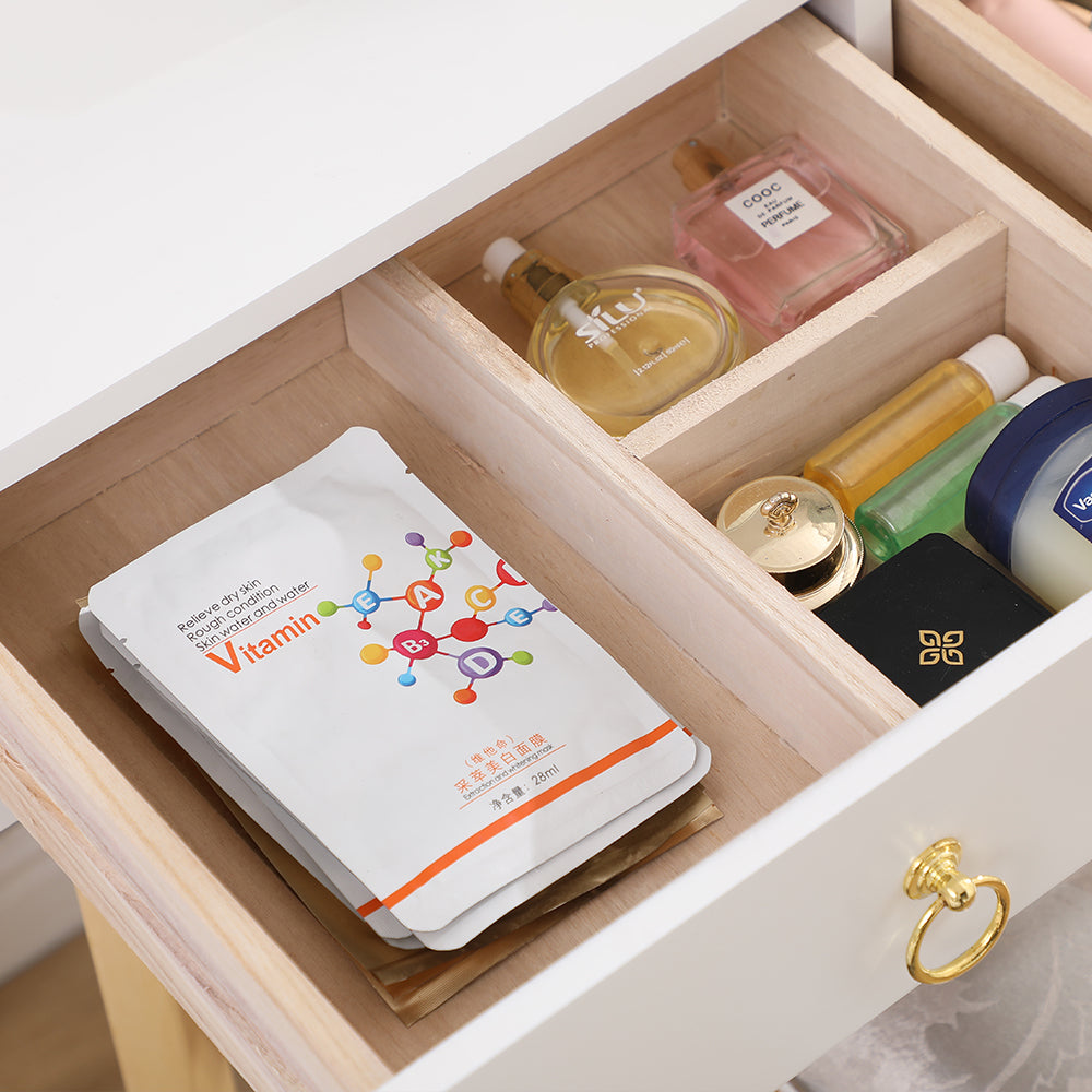 Ideally made this admirable vanity table set with a touch screen freely mirror lamps, this one is sure to impress your guests. With 3 color lighting modes, it will create you an effortless and professional make-up mirror when in different sunlight. This set also comes with ample storage options for convenience to separately store your makeup, jewelry, and cosmetics. Also, the storage drawers will greatly classifies and eliminates the time-consuming search for your make-up tools and beauty essentials.