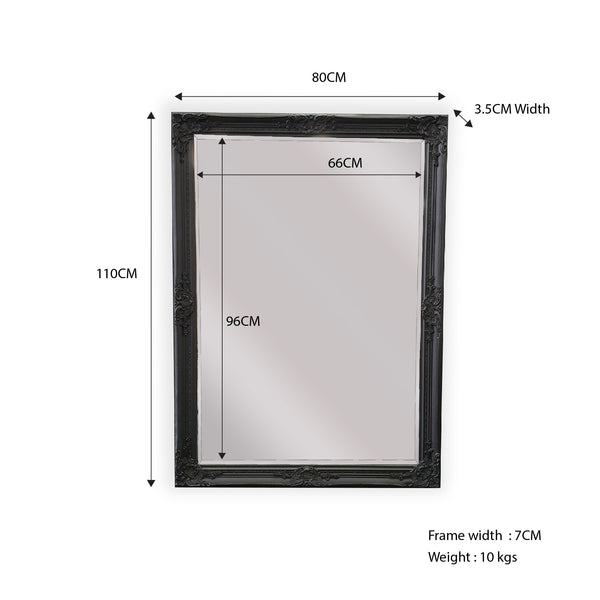 The French Provincial Ornate Mirror in Black - Small 80cm x 110cm is a beautiful and elegant addition to any home decor. The mirror measures 80cm x 110cm and is made from high-quality materials, including wood and mirror.