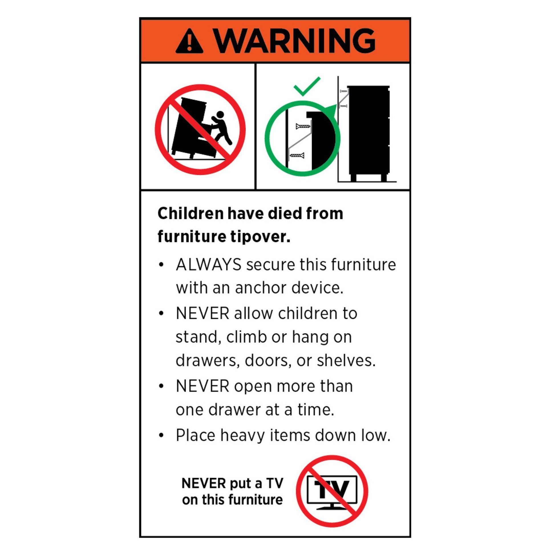 Please note: Children have died from furniture tip-over. Always secure this furniture with an anchor device. Never allow children to stand, climb, or hang on drawers, doors or shelves. Never open more than one drawer at a time. Place heavy items down low. Never put a TV on this furniture.