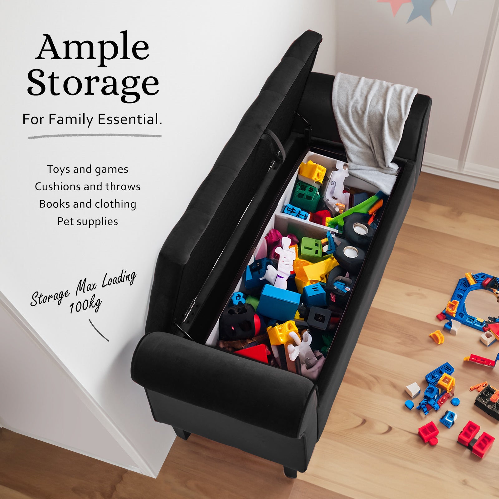 Storage Ottoman Stool Arm Bench Seat 132cm Velvet BLACK